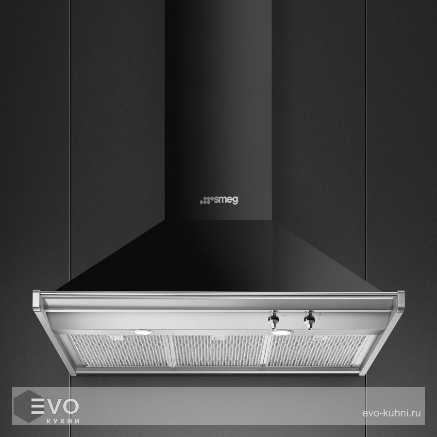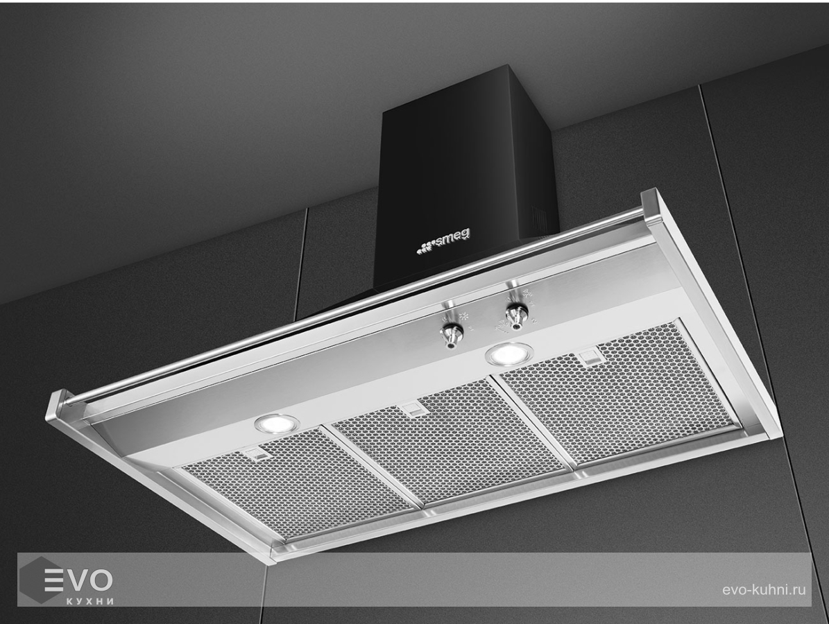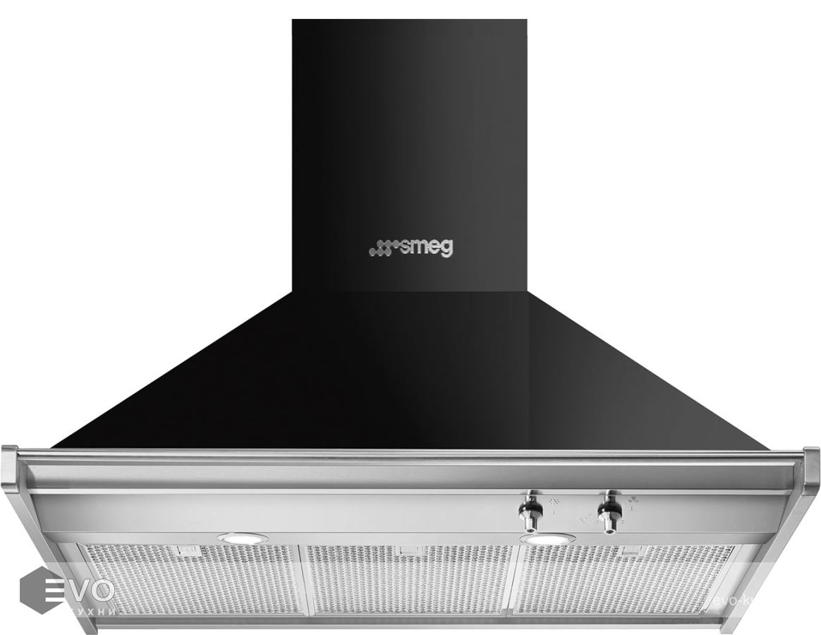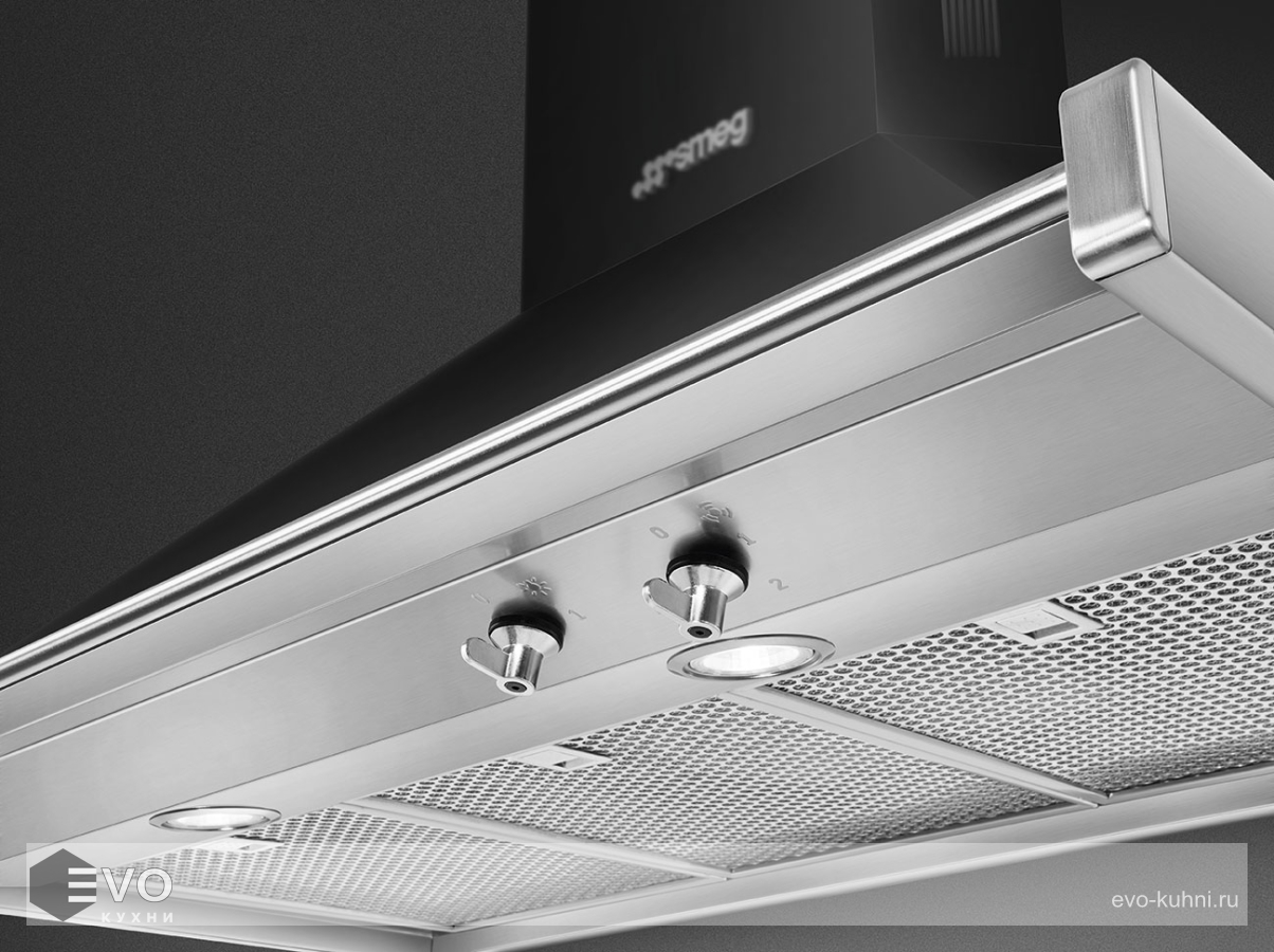 Купольная вытяжка Smeg KD90HNE – модель шириной 90 см может устанавливаться над варочной поверхностью с пятью или шестью конфорками. Для выбора одной из трех скоростей работы служат стальные поворотные переключатели. Три многоразовых жироулавливающих фильтра из нержавеющей стали можно мыть в посудомоечной машине.
