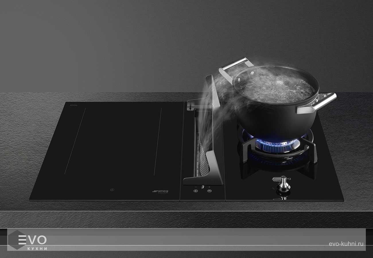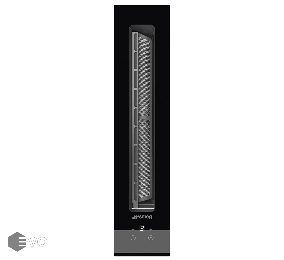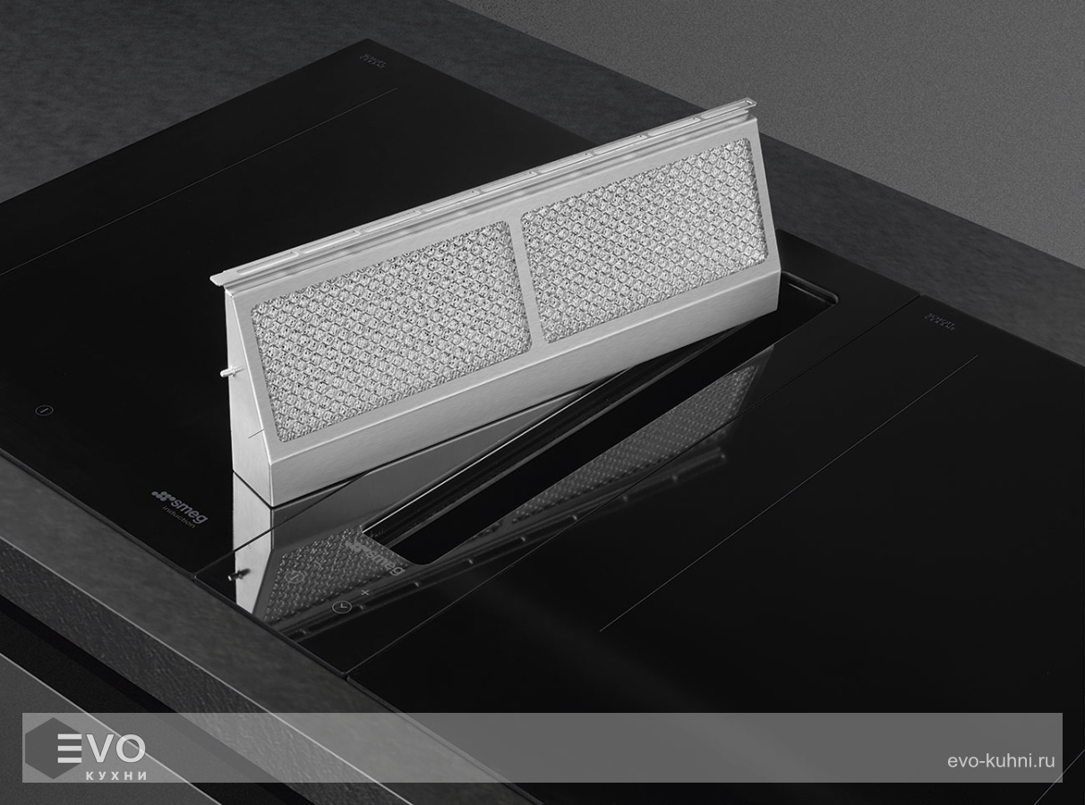 Настольная вытяжка Smeg KDH12WLD – вытяжка с покрытием из черного стекла отлично сочетается с варочными поверхностями Smeg. В инструкции есть схемы установки: вы можете встроить ее сбоку или между несколькими панелями. В комплекте жироулавливающие фильтры, которые можно чистить в посудомоечной машине.