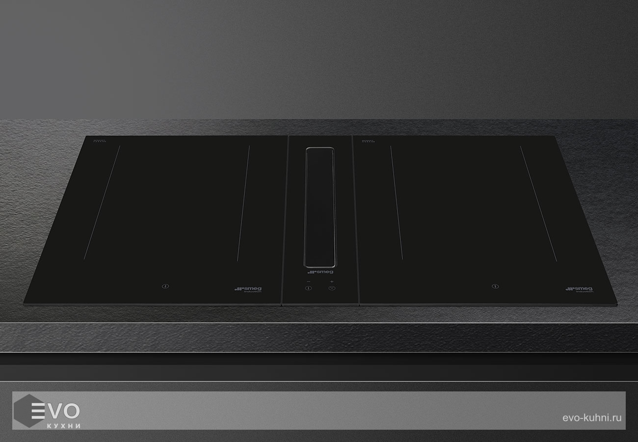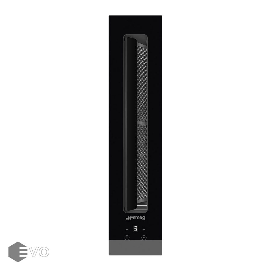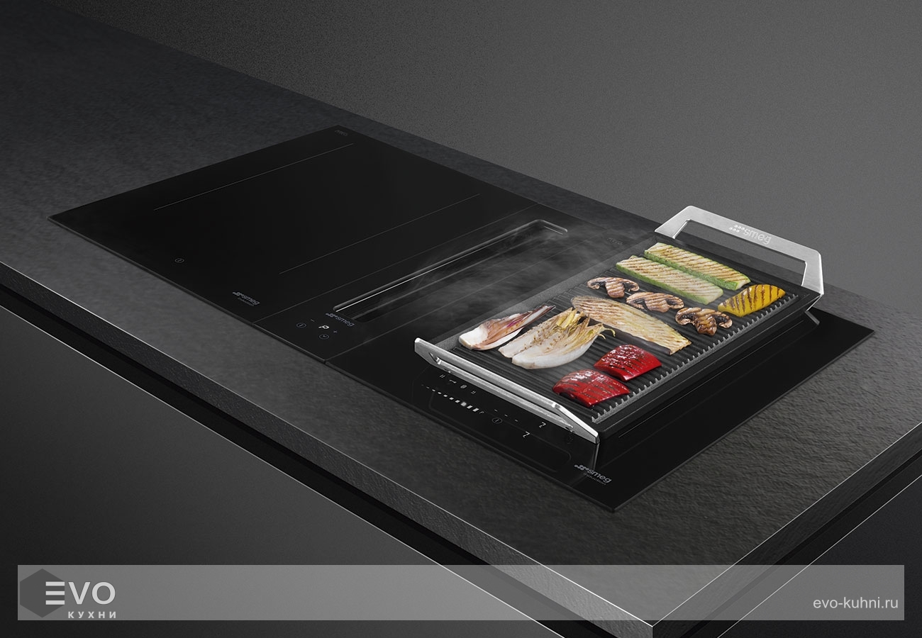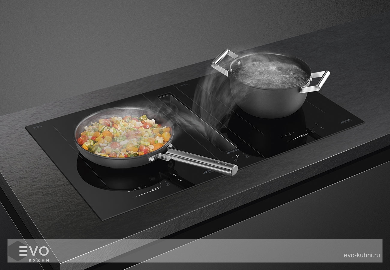 Настольная вытяжка Smeg KDH12WLD – вытяжка с покрытием из черного стекла отлично сочетается с варочными поверхностями Smeg. В инструкции есть схемы установки: вы можете встроить ее сбоку или между несколькими панелями. В комплекте жироулавливающие фильтры, которые можно чистить в посудомоечной машине.