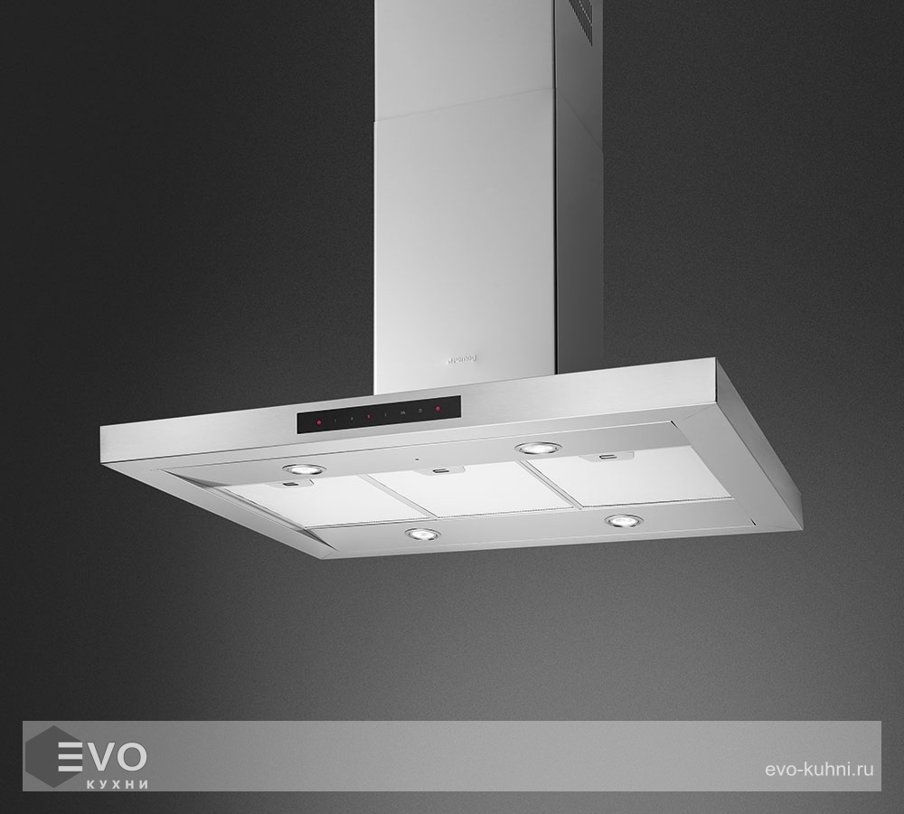Островная вытяжка Smeg KICTIS90BL – островная вытяжка имеет управление Touch Control, которое позволяет устанавливать настройки с помощью простого прикосновения. Благодаря синхронизации прибора с варочными панелями эксплуатация становится ещё более комфортной.