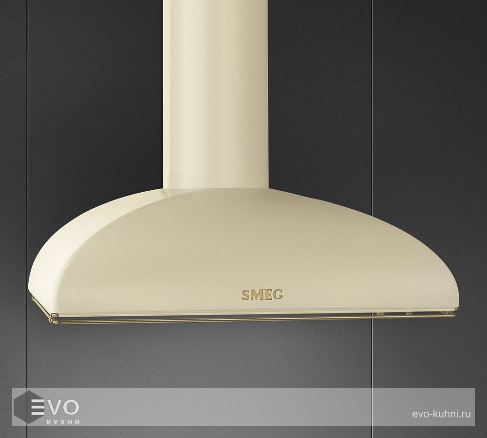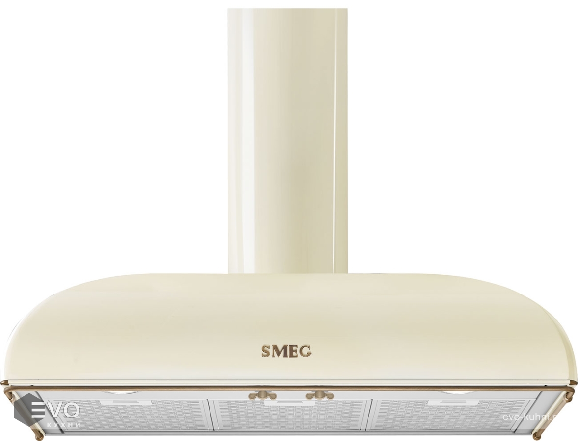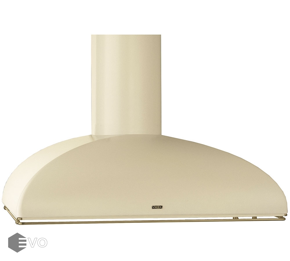 Купольная вытяжка Smeg KS89POE – модель шириной 90 см станет достойным дополнением кухни в классическом или кантри-стиле. Вытяжка может устанавливаться на различной высоте над варочной панелью с пятью или шестью конфорками. Сбоку расположены два механических поворотных переключателя, при помощи которых можно выставить скорость всасывания или включить освещение рабочего места.