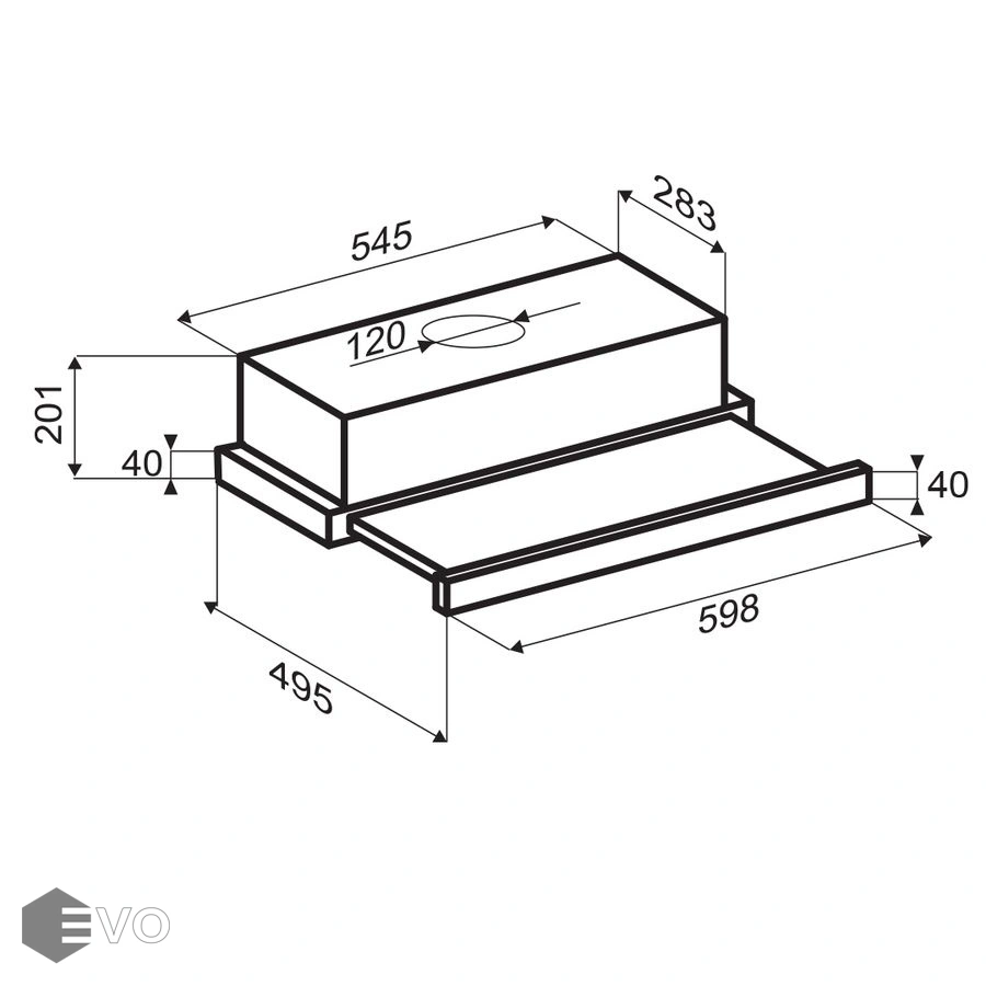- Размеры вытяжки (ШхВхГ) 598х201х283 мм