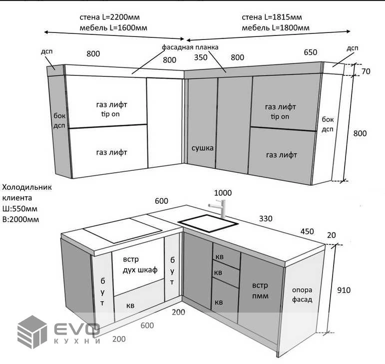 Дизайн-проект, максимально удовлетворяющий вашим пожеланиям, мы делаем бесплатно. Наши менеджеры-дизайнеры помогут вам определиться с моделью вашей будущей кухни, грамотно подберут встраиваемую технику, подберут цветовую гамму самой кухни исходя из стилистики интерьера и пожеланий клиента, составят технически грамотный проект под размеры помещения.