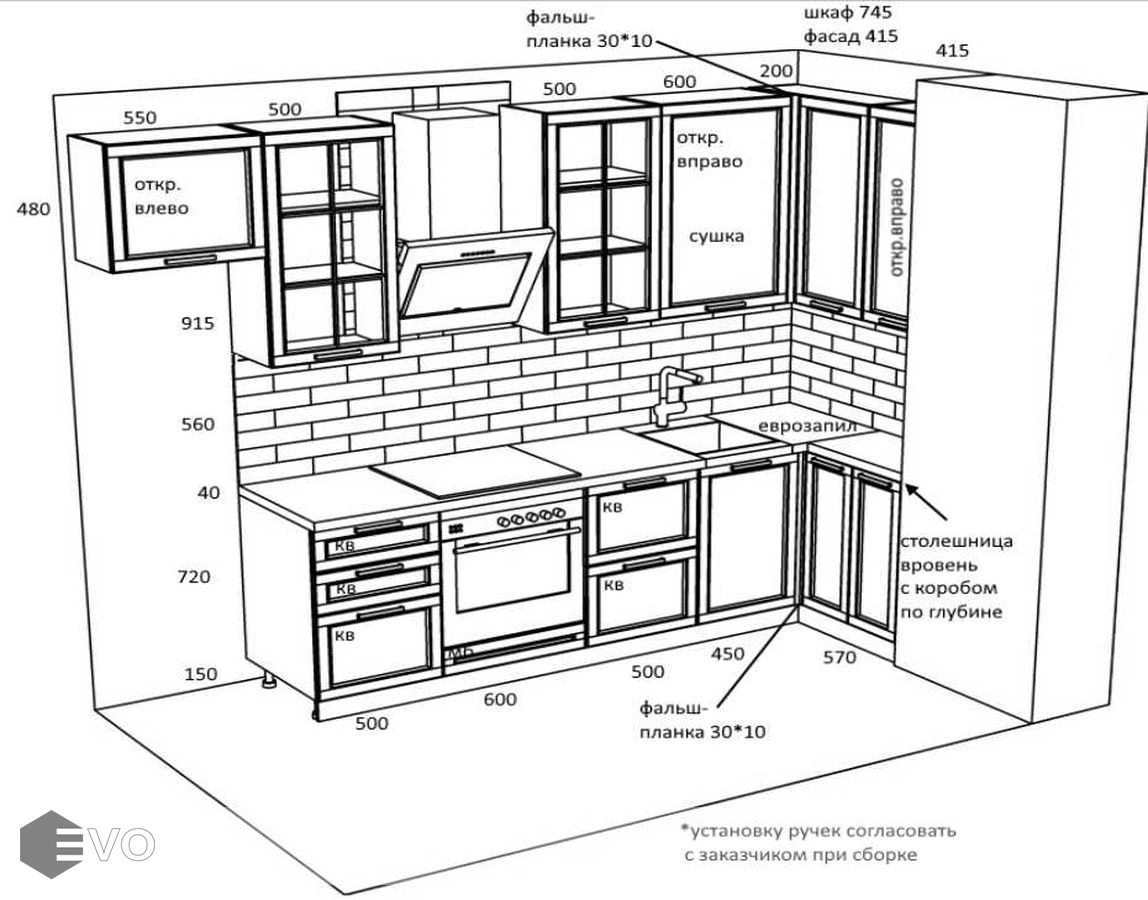 Кухни все изготавливаются по индивидуальному заказу. Мы подготовим дизайн-проект под любое помещение и конфигурацию. В зависимости от выбранных фасадов сможем изготовить нестандартные модули и размеры. Однако есть редкие исключения видов фасадов, по которым невозможны нестандарты, об этом вас предупредит дизайнер при выборе материалов для проекта.