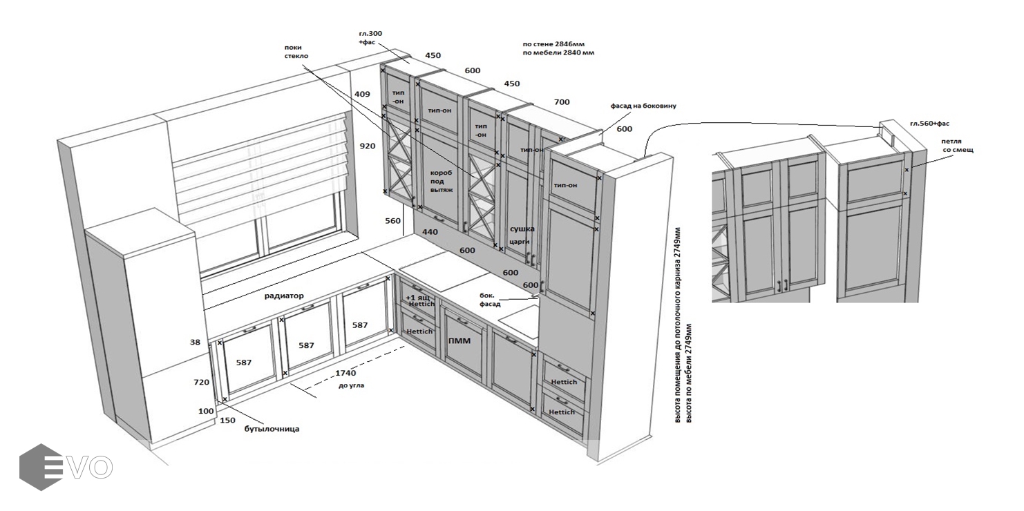 Дизайн-проект, максимально удовлетворяющий вашим пожеланиям, мы делаем бесплатно. Наши менеджеры-дизайнеры помогут вам определиться с моделью вашей будущей кухни, грамотно подберут встраиваемую технику, подберут цветовую гамму самой кухни исходя из стилистики интерьера и пожеланий клиента, составят технически грамотный проект под размеры помещения.