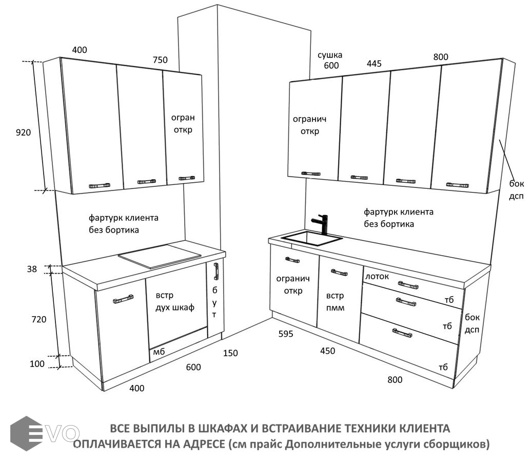 Кухни все изготавливаются по индивидуальному заказу. Мы подготовим дизайн-проект под любое помещение и конфигурацию. В зависимости от выбранных фасадов сможем изготовить нестандартные модули и размеры. Однако есть редкие исключения видов фасадов, по которым невозможны нестандарты, об этом вас предупредит дизайнер при выборе материалов для проекта.