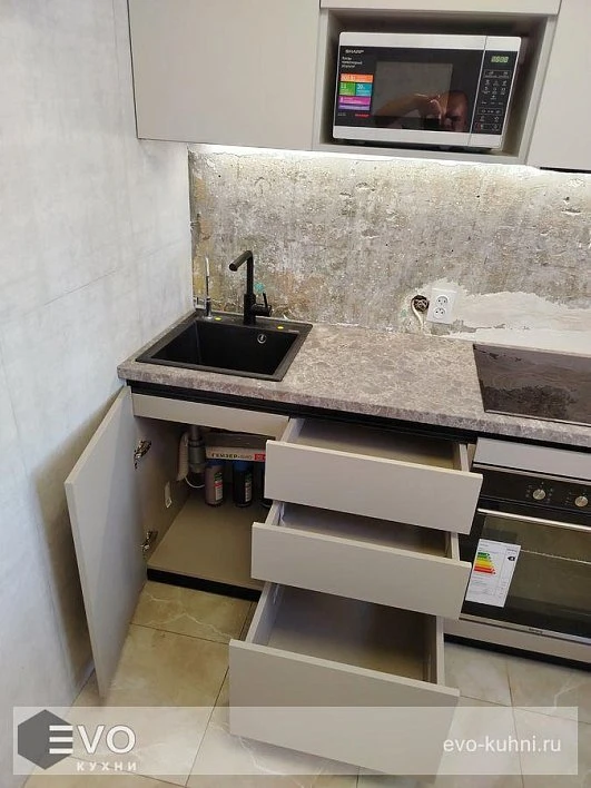Кухни все изготавливаются по индивидуальному заказу. Мы подготовим дизайн-проект под любое помещение и конфигурацию. В зависимости от выбранных фасадов сможем изготовить нестандартные модули и размеры. Однако есть редкие исключения видов фасадов, по которым невозможны нестандарты, об этом вас предупредит дизайнер при выборе материалов для проекта.