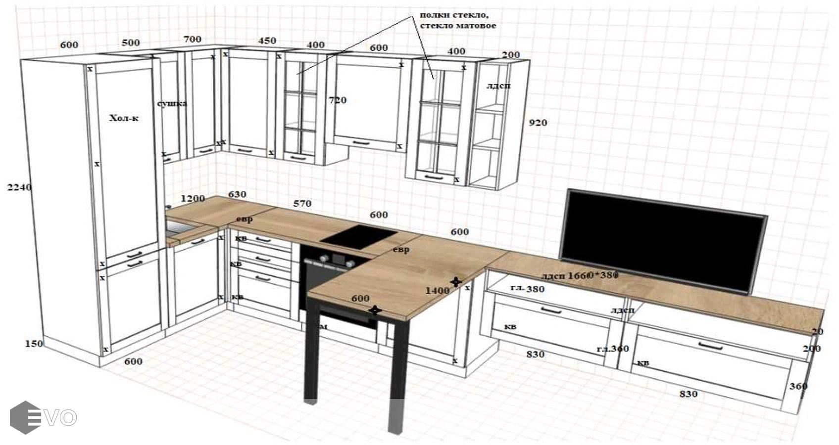 Дизайн-проект, максимально удовлетворяющий вашим пожеланиям, мы делаем бесплатно. Наши менеджеры-дизайнеры помогут вам определиться с моделью вашей будущей кухни, грамотно подберут встраиваемую технику, подберут цветовую гамму самой кухни исходя из стилистики интерьера и пожеланий клиента, составят технически грамотный проект под размеры помещения.