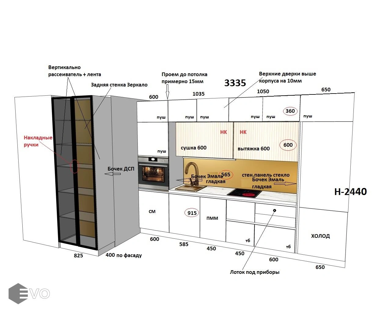 *в стоимость включено мебель, столешница искусственный камень, стеновая панель закаленное стекло, фурнитура, мойка, смеситель, вытяжка, освещение, ручки Голо профиль, сушка, лоток под столовые приборы. Замер, доставка и сборка .