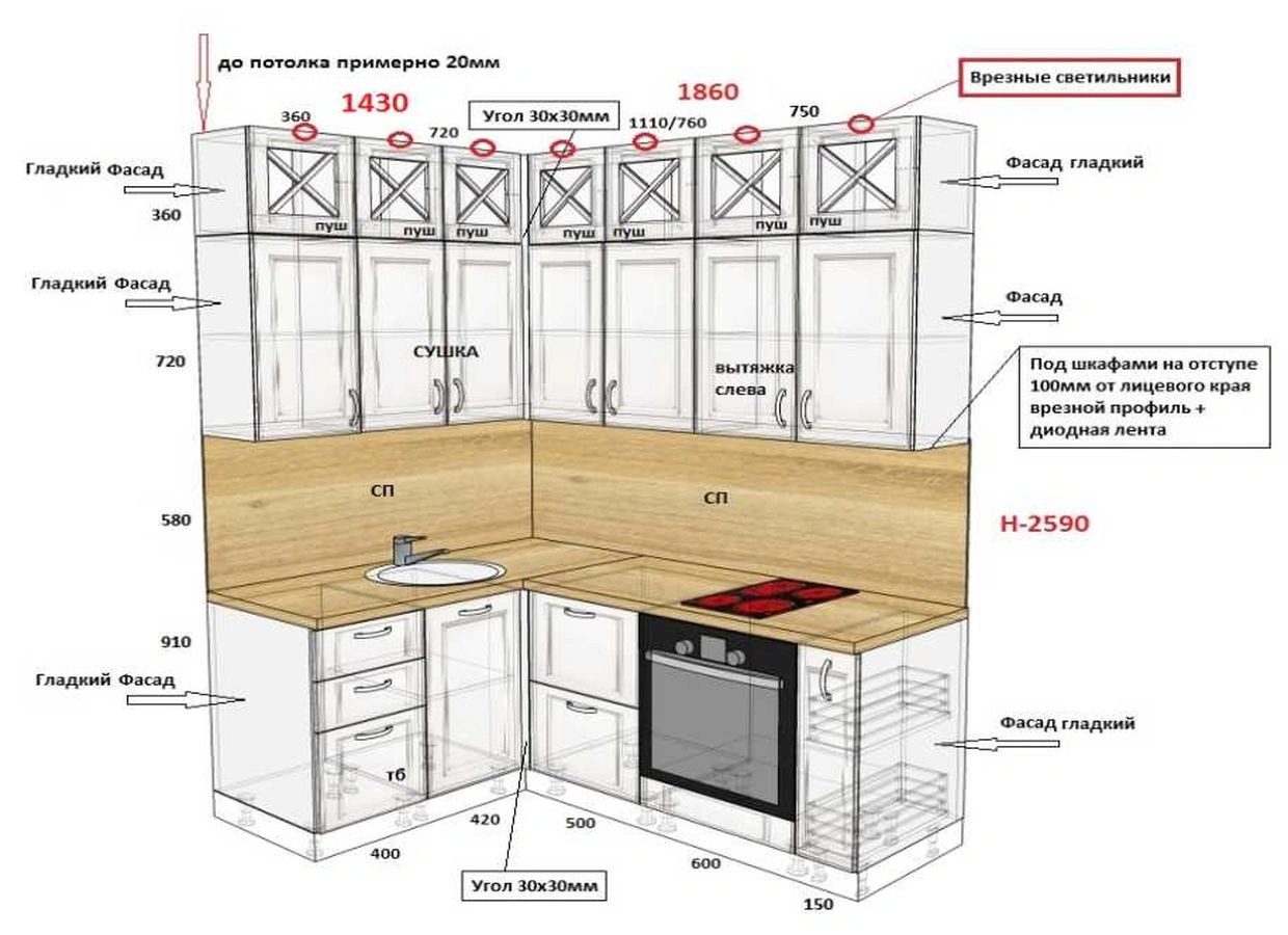 Кухни все изготавливаются по индивидуальному заказу. Мы подготовим дизайн-проект под любое помещение и конфигурацию. В зависимости от выбранных фасадов сможем изготовить нестандартные модули и размеры. Однако есть редкие исключения видов фасадов, по которым невозможны нестандарты, об этом вас предупредит дизайнер при выборе материалов для проекта.