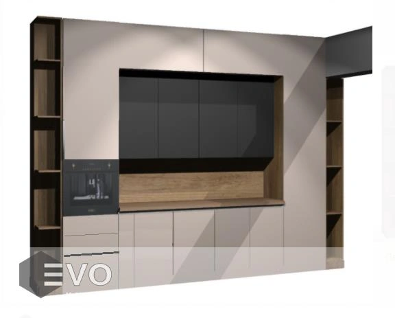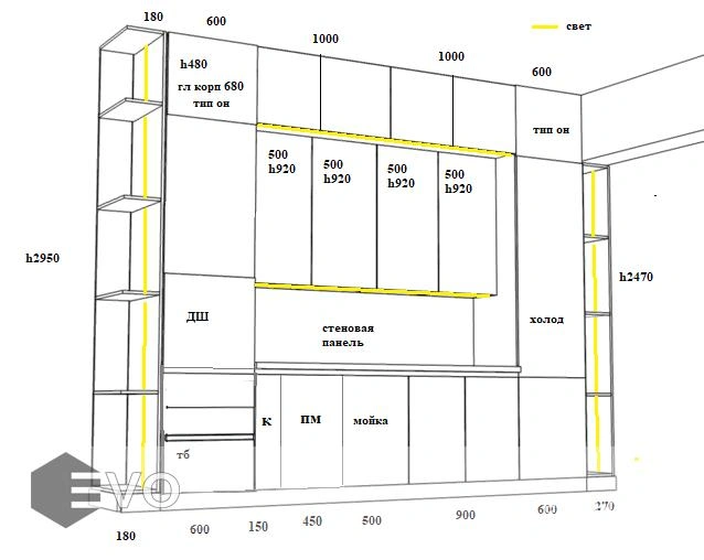 - Особенности: изготовление кухни под потолок , скрытые ручки Голо профиль.