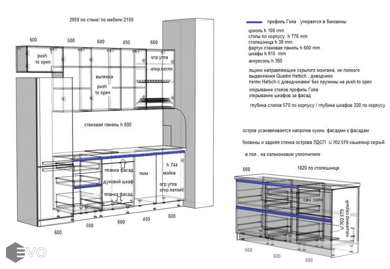 • Размеры: кухня 2150мм,остров 1820*600мм, Высота: 2434мм.