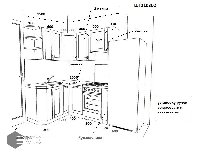 Кухни все изготавливаются по индивидуальному заказу. Мы подготовим дизайн-проект под любое помещение и конфигурацию. В зависимости от выбранных фасадов сможем изготовить нестандартные модули и размеры. Однако есть редкие исключения видов фасадов, по которым невозможны нестандарты, об этом вас предупредит дизайнер при выборе материалов для проекта.
